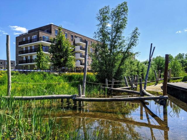 Dit groene park wordt een nieuwe ademruimte in de stad, met plaats voor sport, spel en ontspanning. Bomen zorgen voor een natuurlijke buffer naar de omliggende woningen.